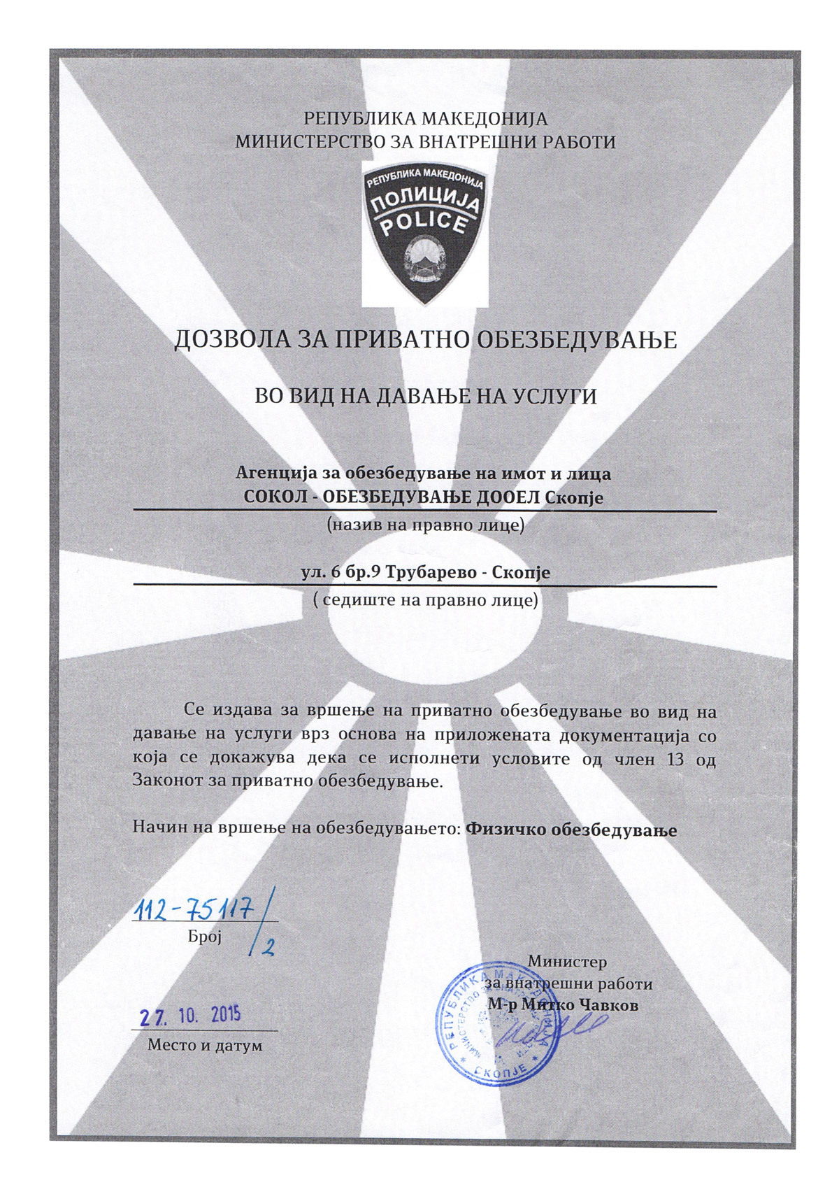 Во 2015 година "Сокол Обезбедување" доби и официјално државно признание и лиценца за приватно обезбедување од Министерството за Внатрешни Работи.